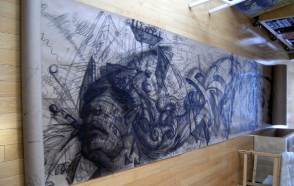 Peinture acrylique sur toile de 60 pouces par 96 pouces.